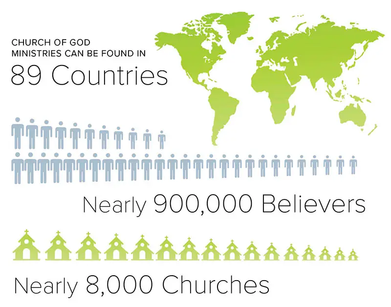 Since 1891, when the movement’s first missionary was sent to Mexico, the Church of God has continued to grow into a multinational community of faith. Average weekend attendance in the congregations of the United States and Canada totals approximately 230,000. There are approximately 2,100 congregations in the United States and Canada. Globally, the movement has work in eighty-nine countries and territories representing more than 7,800 churches and 887,000 believers.